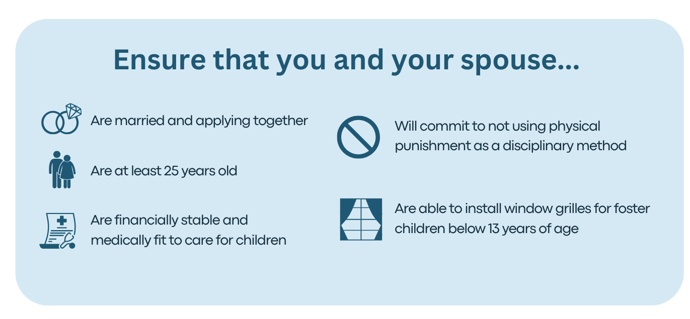 - Commit to provide a child-safe home environment. This includes refraining from the use of physical punishment such as caning or hitting. For foster parents caring for children below the age of 13, a child-safe environment includes having window grilles on all windows.